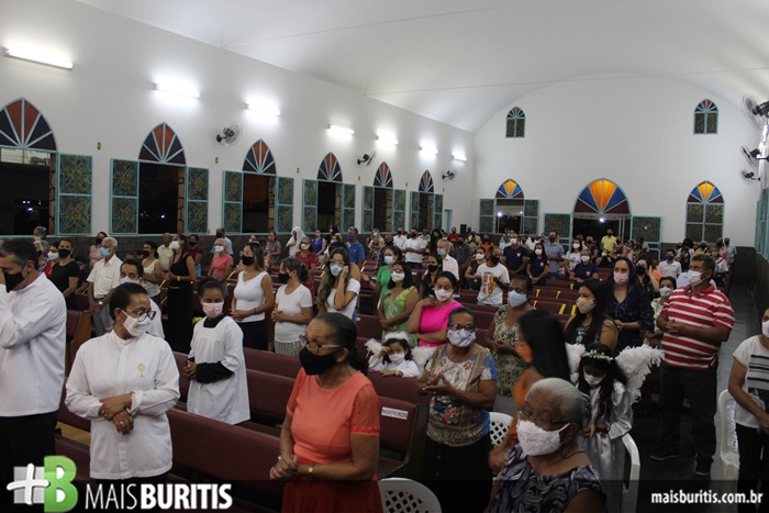 A primeira missa do dia foi celebrada pelo Padre Genilson às 7h na Igrejinha, primeira Matriz de Buritis. Característica das celebrações eucarísticas do dia, um tecido azul, representando o manto de Nossa Senhora, foi passado sobre os fiéis em um sinal de bênçãos.